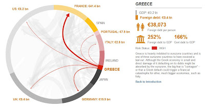 From the BBC - "The circles in this interactive graphic show the gross external, or foreign, debt of some of the main players in the eurozone as well as other big world economies. The arrows show how much money is owed by each country to banks in other nations. The arrows point from the debtor to the creditor and are proportional to the money owed as of the end of June 2011. The colors attributed to countries are a rough guide to how much trouble each economy is in."